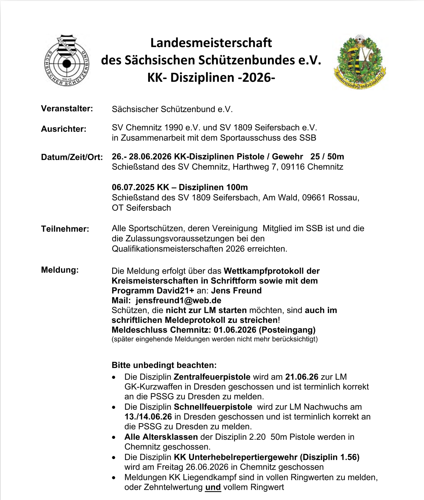 Landesmeisterschaft 2026 des Sächsischen Schützenbundes e.V. in den KK-Disziplinen