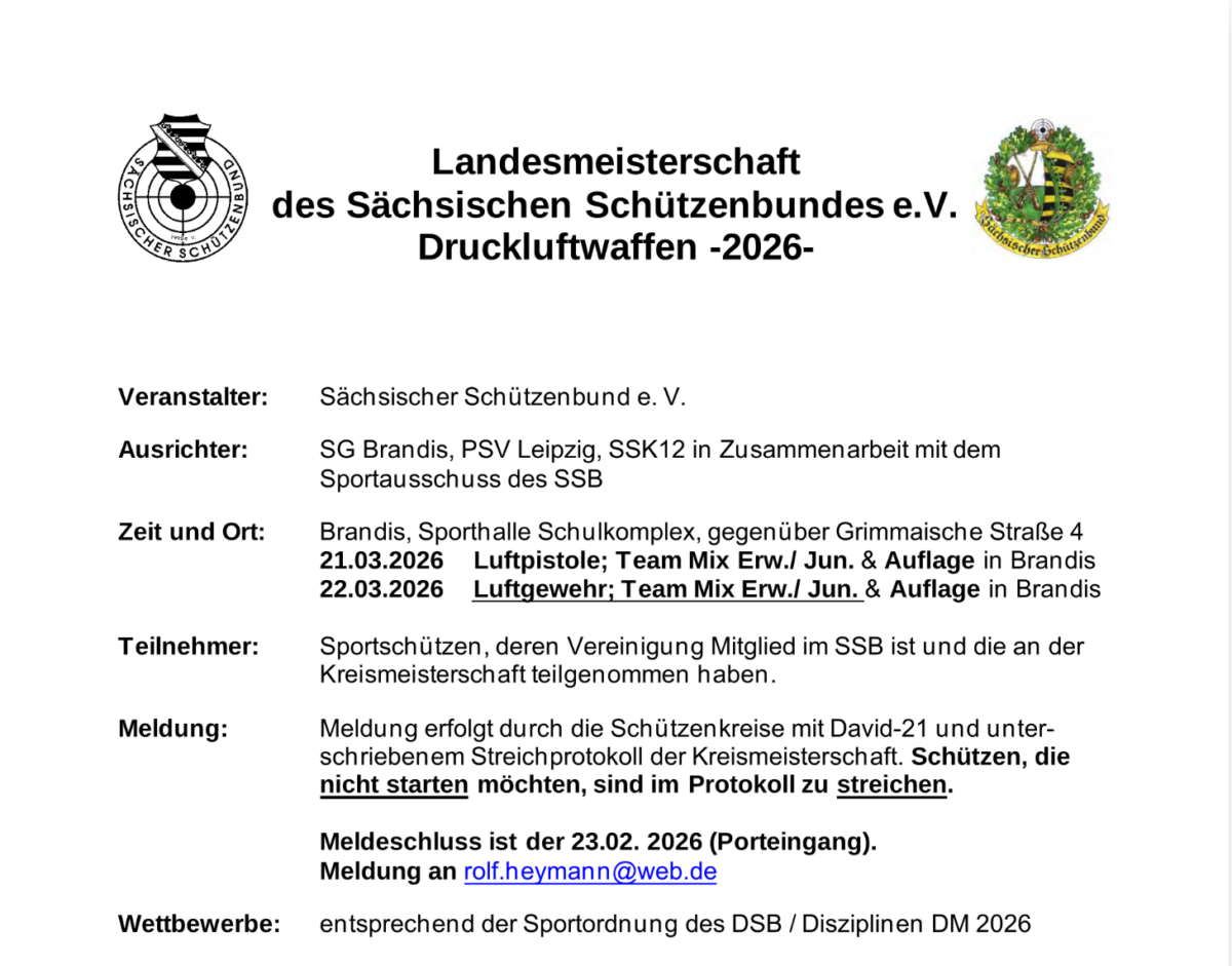 Landesmeisterschaften des Sächsischen Schützenbundes e.V. 2026 – Druckluftwaffen in Brandis